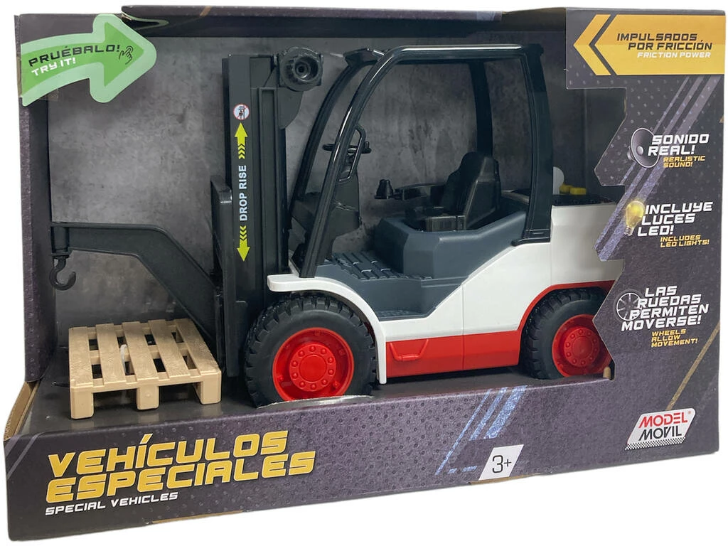 Incluye: 1 vehículo de la construcción Carretilla Elevadora con luces, sonidos realistas y sistema de fricción y 1 palet de color marrón para jugar.
