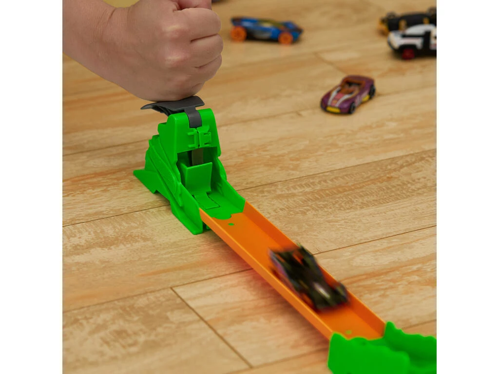 Incluye: 1 vehículo Hot Wheels, 1 cofre de color azul con tapa verde y piezas especiales para crear el circuito 2 en 1 Supersalto Tóxico.