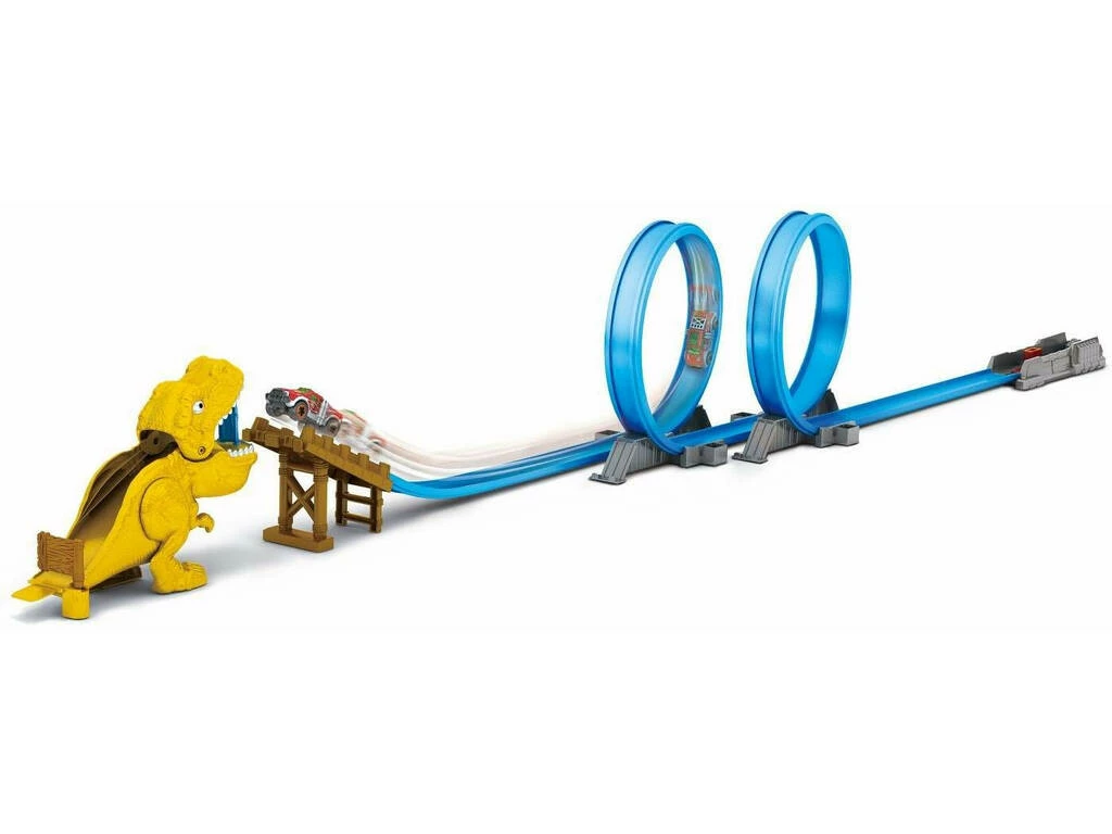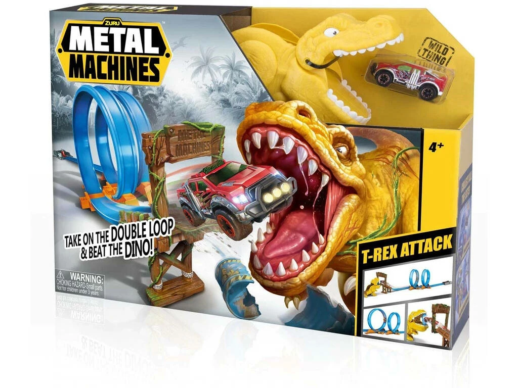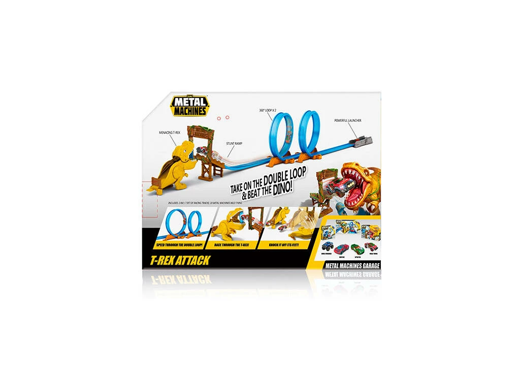 Incluye: 1 vehículo Metal Machines Wild Thing y 1 pista T-Rex Attack con 2 loopings, propulsor y rampa.