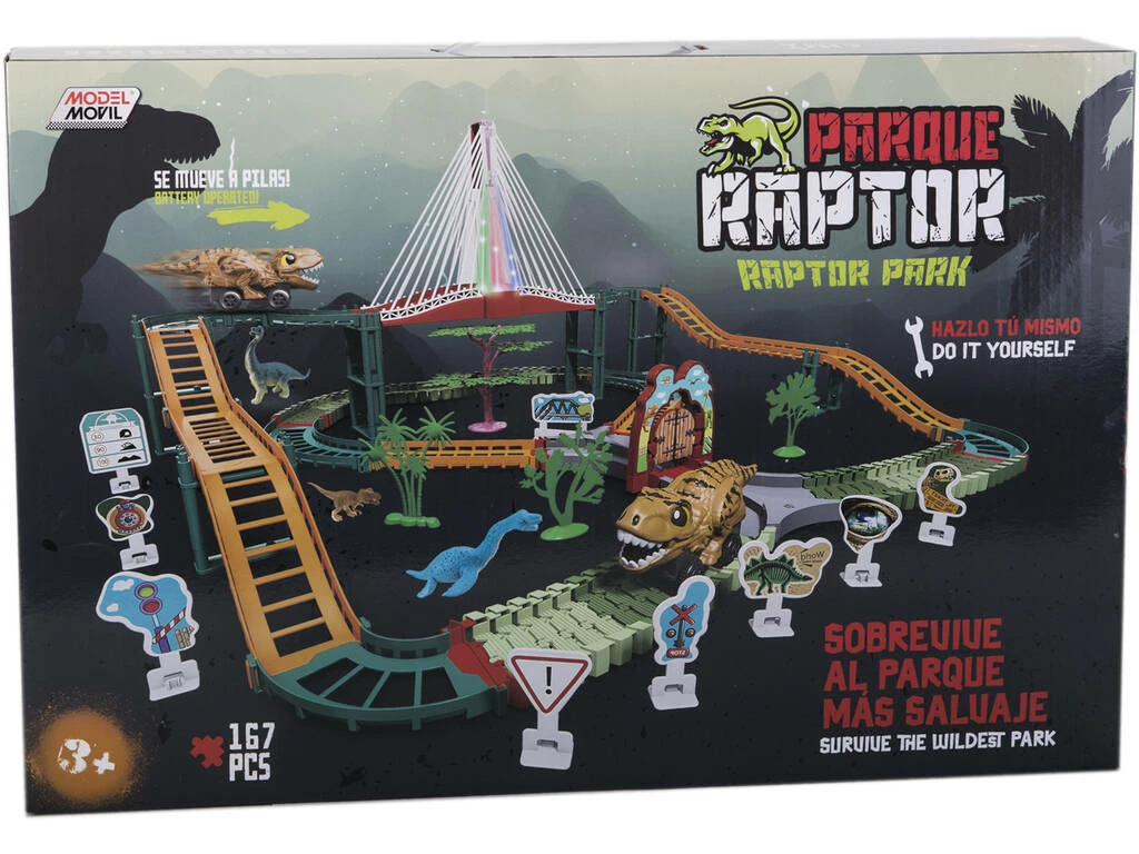 Incluye: 1 vehículo dinosaurio, 6 dinosaurios de goma, 11 señales y 1 circuito Parque Raptor para construir con puente luminoso, rampas, terrenos variados y muchas más sorpresas.