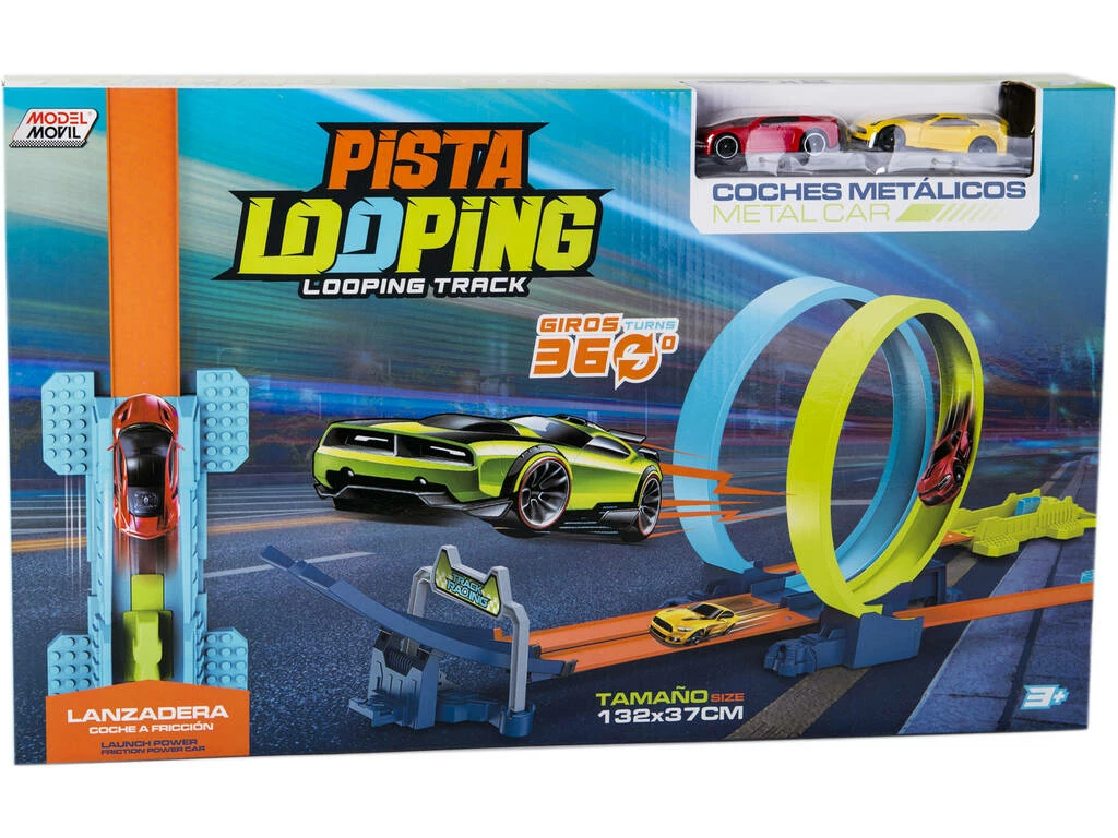 Incluye: 1 Pista Looping con dos lanzaderas de vehículos y rampa final. 1 coche metálico rojo, 1 coche metálico amarillo y 3 barriles de obstáculos con puntuación.