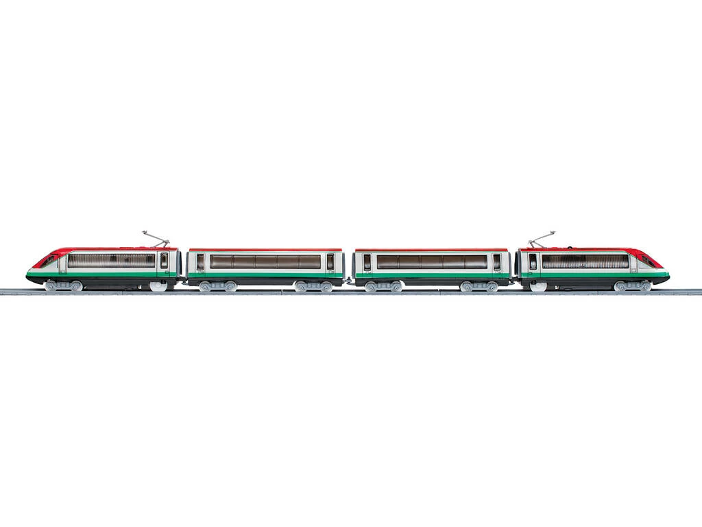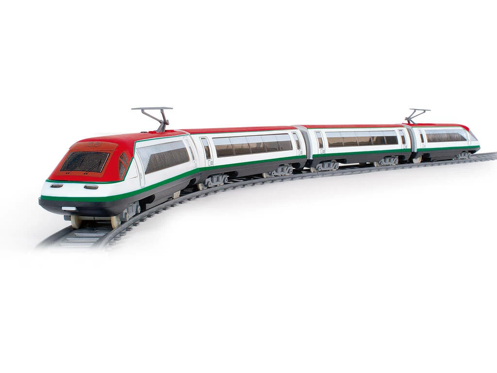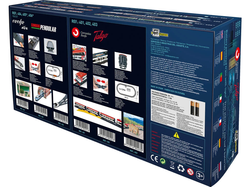 Incluye: 1 caja de almacenaje, 1 locomotora eléctrica a batería Comboi Pendular de color roja, blanca y verde, 2 vagones, 1 locomotora de cola sin motor, 16 vías curvas, 11 vías rectas, 1 estación, 1 encarrilador y 1 túnel.