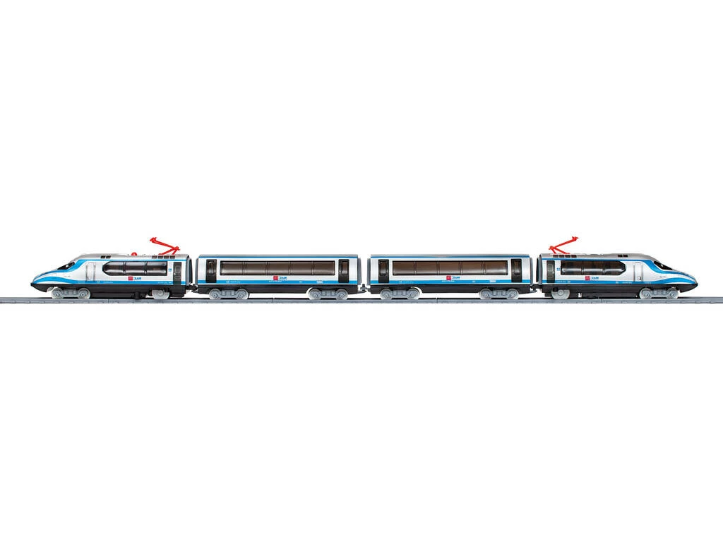 Incluye: 1 caja de almacenaje, 1 locomotora eléctrica a batería HS de color gris y azul con luz, 2 vagones, 1 locomotora cola sin motor, 16 vías curvas, 11 vías rectas, 1 estación, 1 encarrilador y 1 túnel.